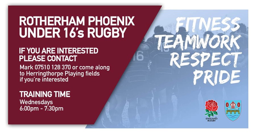 Come along and be part of our U16 Rugby team, we train every Wednesday at 6pm on Herringthorpe playing fields in the flood lit area near to the rugby club or give me a call if you would like more details.